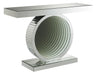 Take breaths away with the striking design of this modern console table. Perfect for the stylish host, a dazzling silver finish covers a geometric silhouette. The base features reflective mirror details and is topped by a circle adorned with rectangular mirrors. Open up a space with the airy silhouette and glass details. The perfect combination of playful elegance, this table is perfect for pictures or as a stylish home bar. Includes: One (1) console table