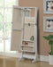 This gorgeous multi-function jewelry Cheval mirror is simple yet practical. At nearly five feet tall, it has sufficient space for reflection and checking your fashion. It opens up to a space with three lower horizontal shelves and plenty of hooks and right holders for necklaces and other precious accessories. A jewelry box built four inches deep protects watches and earrings. The white finish mirror also conveniently tilts to make sure you get your look right. Includes: One (1) jewelry cheval mirror