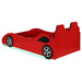 Modern race car aesthetics inform the design of a novelty car bed perfect for kids. Its twin size is versatile, allowing for plenty of space to play within the bedroom. The car is complete with realistic details and features LED strip lighting underneath, creating a fun glow that easily doubles as a nightlight for smaller kids. Curvy sides mimic the lines of a real race car while creating side rails that help keep restless sleepers from slipping out of bed in the night. Black decorative details finish the look, offering realism and whimsy.