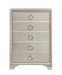 Create a glamorous vibe in a master or guest bedroom. This gorgeous, silver chest emanates graceful elegance. A metallic silver finish gives it a lovely touch of sparkle. Mirrored acrylic accents add even more stunning shine. With five spacious English dovetail drawers, including a felt lined top drawer, this wooden chest is a stylish way to meet your storage needs. Includes: One (1) chest