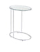 Bright and stylish, this rounded snack table offers a delicate upgrade to the classic coffee table. Great for small spaces, the open glass top is full of airy details. Sleek and smooth, thin chrome legs create an elongated feel that connects in an open oval. The versatile design looks great next to a sofa or chair. Transform a modern or classic room with its sleek simplicity. Includes: One (1) side table