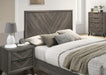 Something about this bed's cool gray finish and chevron grain pattern gives it a stylish vibe. The diagonal replicated grain meet at the center line, forming a V-shaped pattern found on the headboard and front panels. Contemporary elements continue throughout this ensemble, with the black angled legs and sleek finger pulls found on the matching case goods. Coordinating pieces like this set offer a stress-free experience in updating your bedroom decor.