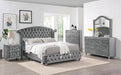ZOHAR Dresser, Gray, 58 1/2"W X 17 1/2"D X 36"H, 136.4lbs. Showcase your personal taste with this bold statement piece in your bedroom. Fully upholstered in flannelette, this dresser features padded fabric and crystal buttons. Each drawer handle is made of glistening acrylic crystals, while silver-painted cabriole legs are perfect in bringing in majestic vibes that this ensemble set out to do.