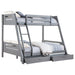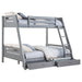 Reimagine a kid's bedroom with the versatility of a modern twin-over-full bunk bed with drawers underneath. Perfect for a range of spaces, it's a great choice for guest accommodations, siblings sharing a room, and sleepovers with friends. The bed boasts wooden construction with a soft grey finish that instills contemporary flair. The upper twin bed includes safety rails and a ladder that installs on either the left or right to best suit your space. Under the lower full bed, two drawers create added storage, perfect for linens, seasonal clothing and much more.