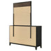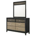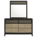 Elevate your bedroom's ambience with this dresser and mirror set, where modern meets Art Deco in a symphony of design. This six-drawer dresser, crafted from sturdy wood and wood products, boasts a striking black and light brown finish that anchors the room with sophistication. The dresser's geometric cutout trim and metal hardware accentuate its artisanal charm, offering both beauty and functionality with Kenlin glides for smooth operation. Above, the rectangular mirror, framed in a bold black border, features captivating geometric patterns and beveled glass, enhancing the space with depth and character. Together, this duo transforms your bedroom into a stylish retreat, blending artisan craftsmanship with the allure of Art Deco inspiration.