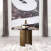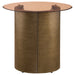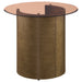 Envision the warmth of a golden sunset captured in the form of furniture—this is the essence of our round end table with its tawny tempered glass top. The cylindrical metal base, revealing a tantalizing glimpse of space through its open section, is finished with a hand-detailed brush in a lustrous bronze. This table doesn't just stand; it embraces the room with a gentle opulence. The brushed finish dances with light, illuminating the artisan's touch, while the glass whispers of elegance.