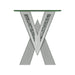 Dress up a living room with the stunning, sparkling design of this gorgeous, silver end table. This beautiful piece begins with a bold, V-shaped silhouette that exudes sculptural appeal. Glittering crystal accents elevate the look with a lovely touch of sparkle. Gleaming mirror panels add spectacular dimension to its rich, regal design. Complete with a square, beveled top made with sturdy tempered glass, this magnificent piece gives any room an elegant, upscale look. Includes: One (1) end table