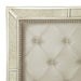 LORAINE Queen Bed, 88"L X 64 1/4"W X 68"H, 244.2lbs. This is what luxury feels and looks like in the bedroom. The padded leatherette headboard and footboard are beautifully complemented by antique mirror borders, which are also found on the case goods' front panels. Stylish details like the nailhead trim and button tufting, ring drawer pulls on the case goods drawers, and silver finish all add polish to this sophisticated bedroom set.