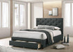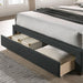 SYBELLA Cal.King Bed, Dark Gray, 91"L X 74 5/8"W X 46 1/2"H, 182.6lbs. Comfort and functionality are the hallmarks of this fully upholstered, mattress-ready bed. On the comfort side, there's the rich linen-like fabric that wraps around the frame of the bed, culminating in a simple rectangular headboard with beautiful diamond tufting. Functionality-wise, the foot end of the bed is a smooth rolling drawer with casters; it's the perfect storage spot for any extra pillows or beddings within arm's reach.