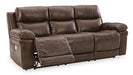 When you curl up in this power reclining sofa and loveseat package featuring adjustable headrests, you won't want to get up. It has genuine leather throughout the seating areas, in an easygoing charcoal gray hue that pairs up comfortably with most color schemes. This cozy set will be your go-to spot for watching TV, reading, or just closing your eyes and drifting off to sleep. Perfectly positioned cushions and overstuffed pillow top arms allow unparalleled relaxation. With a look that turns heads, this power pair includes extended ottomans for enhanced comfort, and adjustable headrests for a primo view of the TV even when you're fully reclined. Each piece is a dual-sided recliner: the sofa has a stationary middle seat, and the loveseat has a lift-top console with a storage compartment and cup holders.