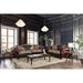Quirino Burgundy/Dark Brown Love Seat, 71"L X 38"W X 42"H, 150lbs. For a traditional set, this sofa and love seat pair has a few surprises. The seat features a distinct two-tone back with tufted leatherette breaking up the beautifully-patterned fabric. A contrasting welt spices up the otherwise standard, single seat cushion. An intricately carved wooden trim frames the rolling arms and a shaped crest plaque the skirt and backing emphasize the sophistication of this collection. Features: Traditional Burgundy/Dark Brown Chenille, Leatherette, Solid Wood Frame Intricate Wood Trim Rolled Arms High-Density Foam Cushions Loose Back Pillows Pillows Included