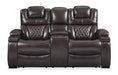 Your modern living room awaits with this power dual-sided reclining loveseat. Complete with practical faux leather upholstery, one-touch power controls, adjustable headrests and USB ports, it makes finding the best seat in the house a breeze. Cup holders and a storage console keep drinks, snacks and remotes close by. Go ahead—treat yourself to a high-design home theater experience, priced to put you at ease.